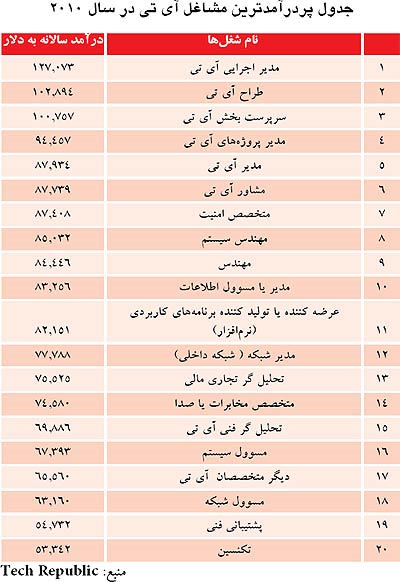 اما در میان این مشاغل برتر، لیست پردرآمدترین مشاغل آی‌تی بیشتر از برترین شغل‌های حوزه آی‌تی خودنمایی می‌کند. براساس بررسی‌‌ها و آمار‌های ارائه شده توسط Tech Republice می‌توان با بیست شغل پردرآمد کارمندان و شاغلان بخش‌های آی‌تی آشنا شد. در این لیست، می‌توان نام ده شغل پر درآمد را دید که در میان برترین مشاغل آی‌تی سال 2010 نیز دیده شده‌اند.