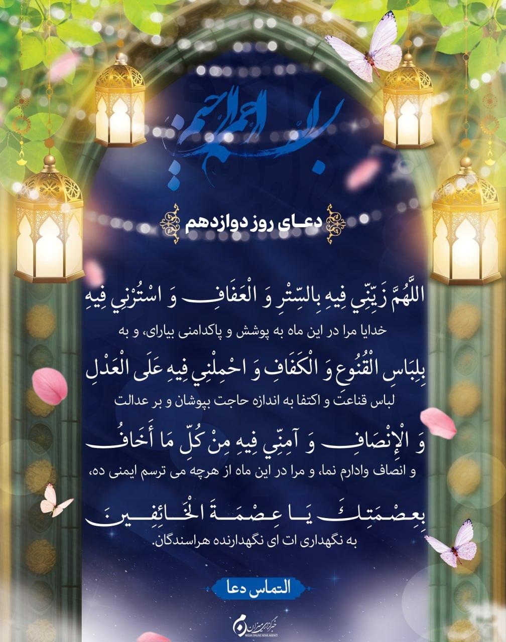 «خدایا زینت ده مرا در آن با پوشش و پاکدامنی و بپوشانم در آن جامه قناعت و خودداری و وادارم نما در آن بر عدل و انصاف و آسودهام دار در آن از هر چیز که میترسم به نگاهداری خودت ای نگهدار ترسناکان.»