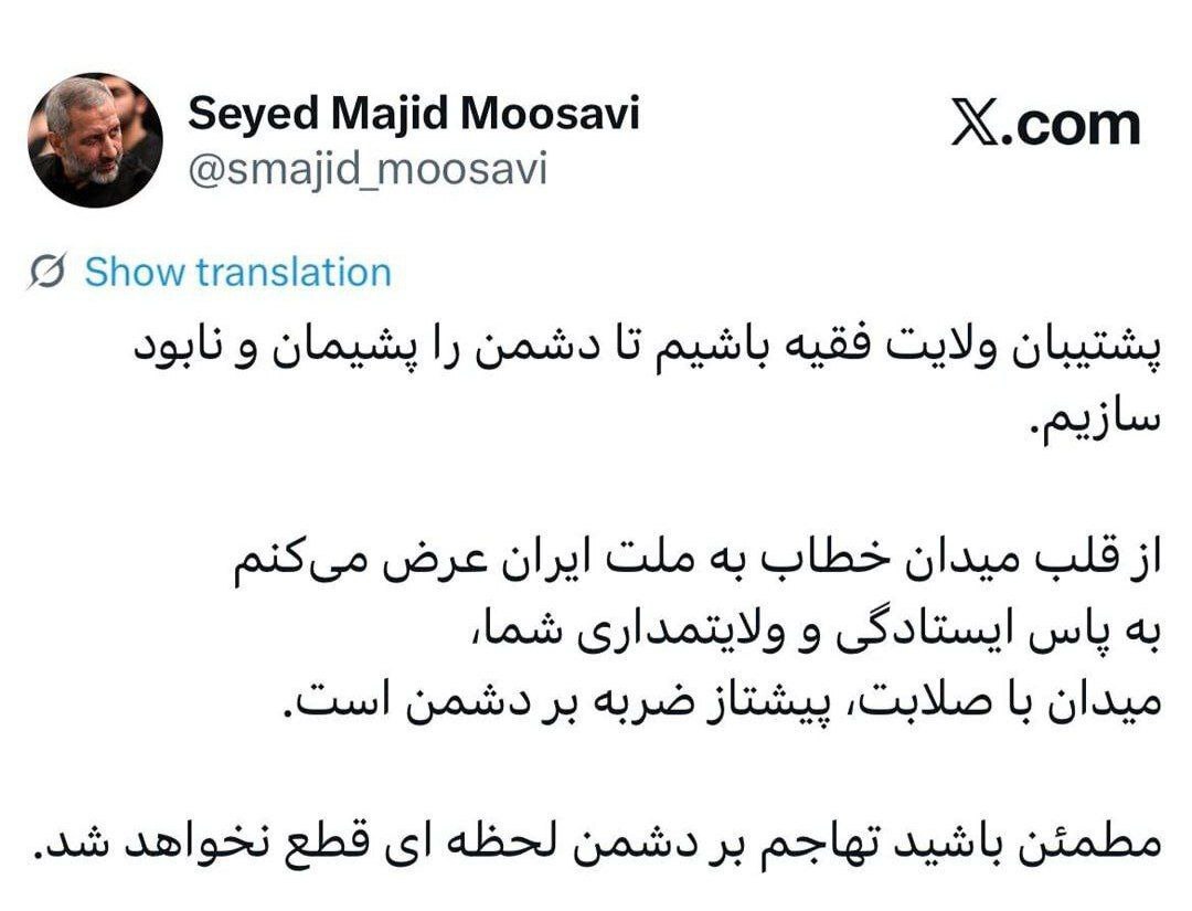 به گزارش تابناک، سید مجید موسوی، فرمانده نیروی هوافضای سپاه خطاب به مردم شریف ایران نوشت: