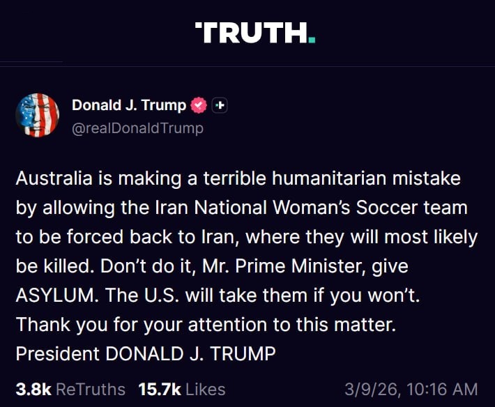به گزارش تابناک، رئیس جمهور آمریکا روز دوشنبه ۱۸ اسفند در صفحه تروث سوشال خود نوشت: «استرالیا با اجازه دادن به بازگرداندن تیم ملی فوتبال زنان ایران به ایران، جبرانناپذیرترین اشتباه انسانی را مرتکب میشود، از نخستوزیر استرالیا میخواهم که به بازیکنان تیم ملی فوتبال زنان ایران پناهندگی بدهد. اگر شما ندهید، آمریکا آنها را خواهد پذیرفت.»
