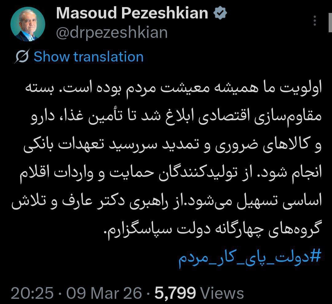اولویت ما همیشه معیشت مردم بوده است. بسته مقاومسازی اقتصادی ابلاغ شد تا تأمین غذا، دارو و کالاهای ضروری و تمدید سررسید تعهدات بانکی انجام شود. از تولیدکنندگان حمایت و واردات اقلام اساسی تسهیل میشود. از راهبری دکتر عارف و تلاش گروههای چهارگانه دولت سپاسگزارم.
