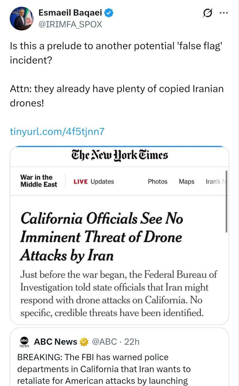 اسماعیل بقائی، سخنگوی وزارت امور خارجه در واکنش به گزارش شبکه تلوزیونی ABC آمریکا مبنی بر احتمال حمله پهپادی ایران به سواحل غربی آمریکا در شبکه اجتماعی ایکس نوشت: