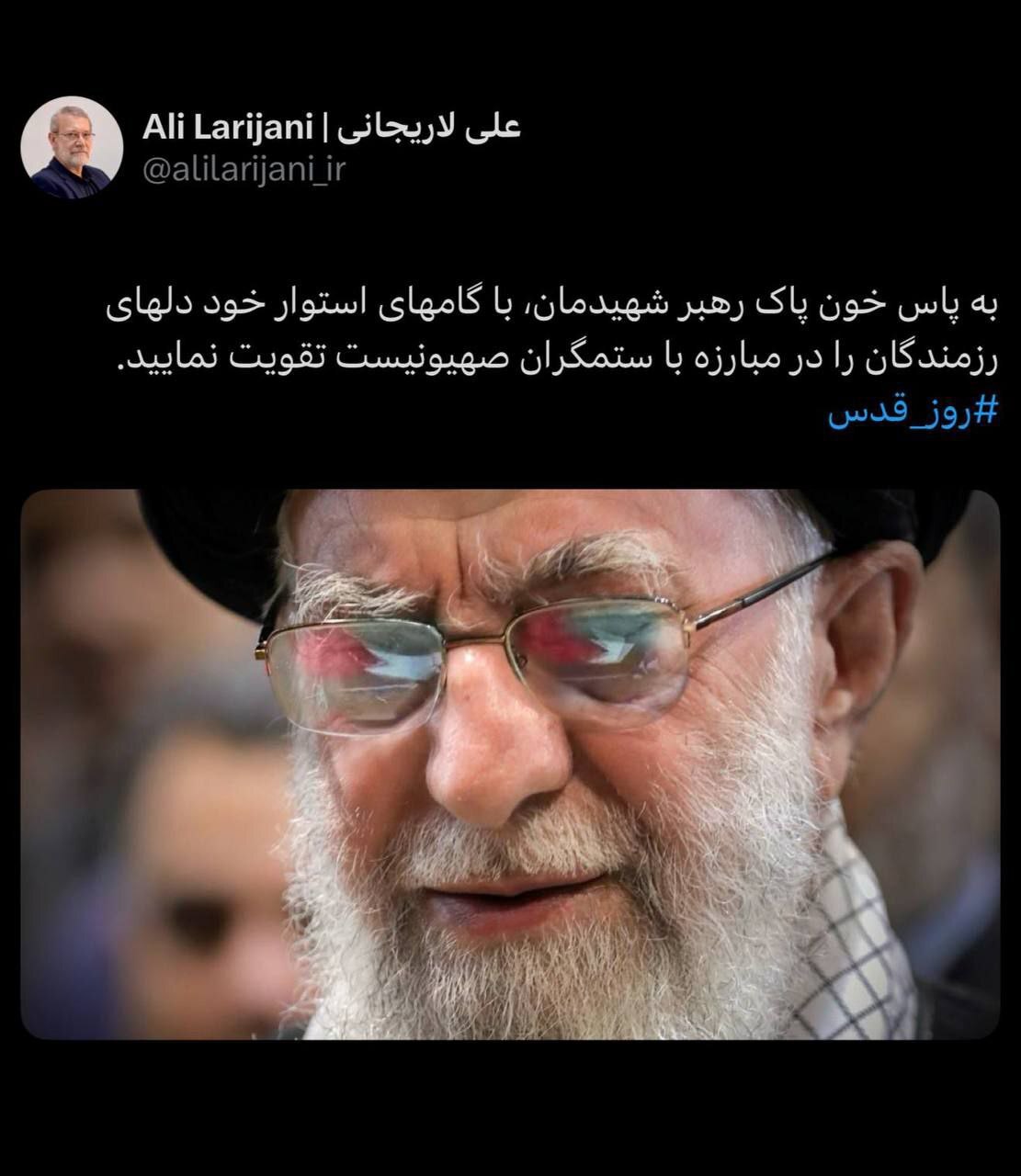 لاریجانی: به پاس خون پاک رهبر شهیدمان، با گامهای استوار خود دلهای رزمندگان را در مبارزه با ستمگران صهیونیست تقویت نمایید