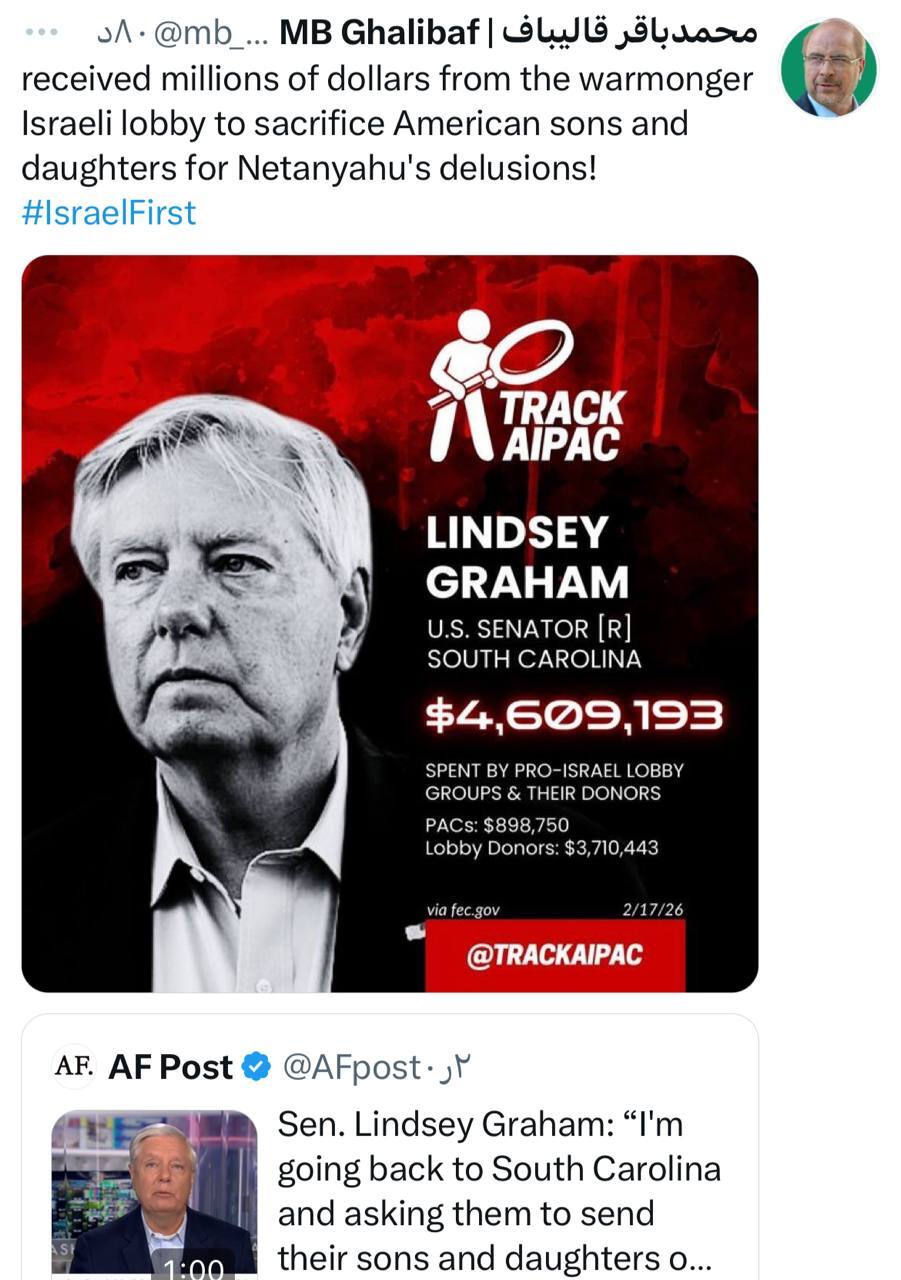 رئیس مجلس در واکنش به تلاش لیندسی گراهام سناتور جنگطلب آمریکایی که اخیرا گفته «به کارولینای جنوبی میرم و از مردم میخوام پسرها و دخترهاشون رو به جنگ در خاورمیانه بفرستند»، با اشاره به ۴.۶ میلیون دلاری که گراهام از لابی صهیونیستی آیپک دریافت کرده، در شبکه ایکس نوشت: «میلیونها دلار از لابی جنگطلب اسرائیل دریافت کرده تا پسران و دختران آمریکایی را فدای توهمات نتانیاهو کند! #اول_اسرائیل».