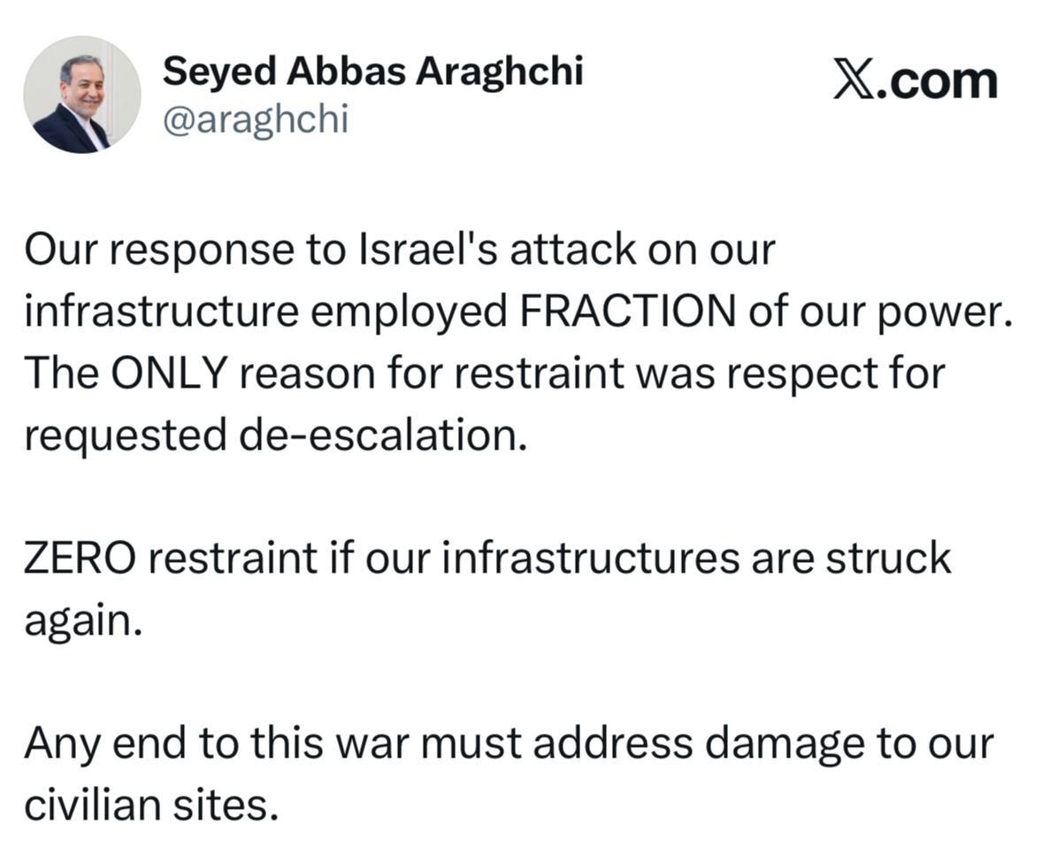 سید عباس عراقچی نوشت: اگر حمله به زیرساخت‌های ما تکرار شود دیگر هیچ خویشتن‌داری وجود نخواهد داشت، پاسخ ما به حملات دیشب اسرائیل به زیرساخت‌های‌مان تنها بخشی از قدرت ما بود؛ تنها دلیل این خویشتن‌داری احترام به درخواست‌های کاهش تنش بود.