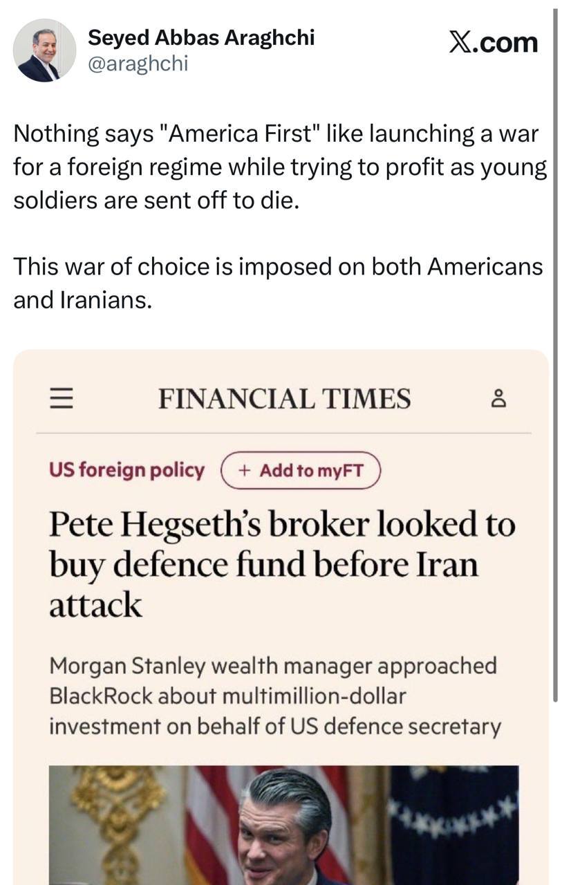 به گزارش تابناک، سید عباس عراقچی وزیر امور خارجه جمهوری اسلامی ایران در مطلبی در شبکه اجتماعی ایکس نوشت: «هیچچیز به اندازه آغاز یک جنگ به نفع یک رژیم خارجی (اسرائیل)، و انتفاع مادی از کشته شدن سربازان جوانی که به میدان اعزام میشوند، شعار «اول آمریکا» را به سخره نمیگیرد. »