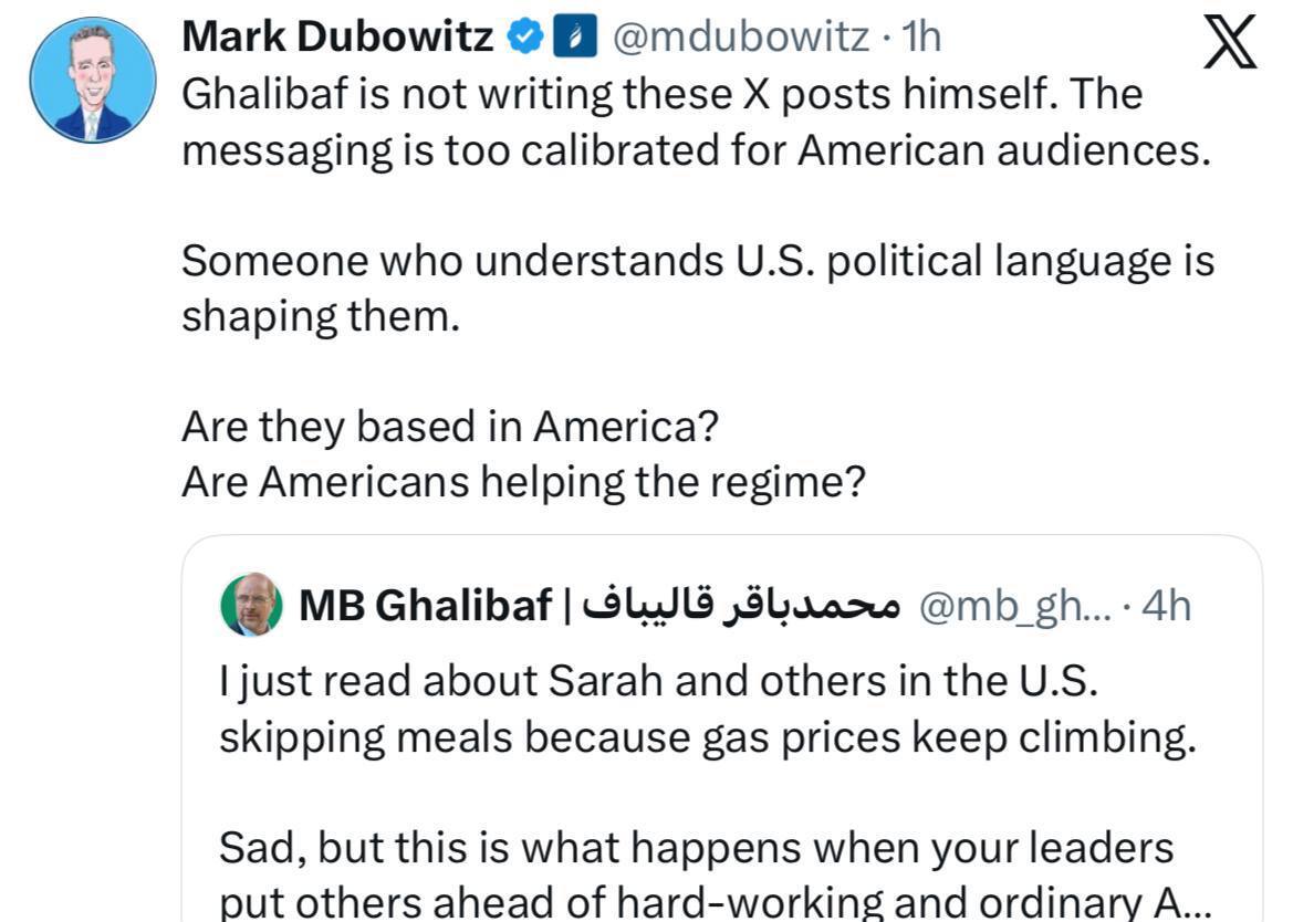 به گزارش تابناک؛ مارک دوبوویتز رییس بنیاد ضد ایرانی دفاع از دموکراسی ها در واکنش به توییت اخیر قالیباف خطاب به شهروندان امریکایی گفته: