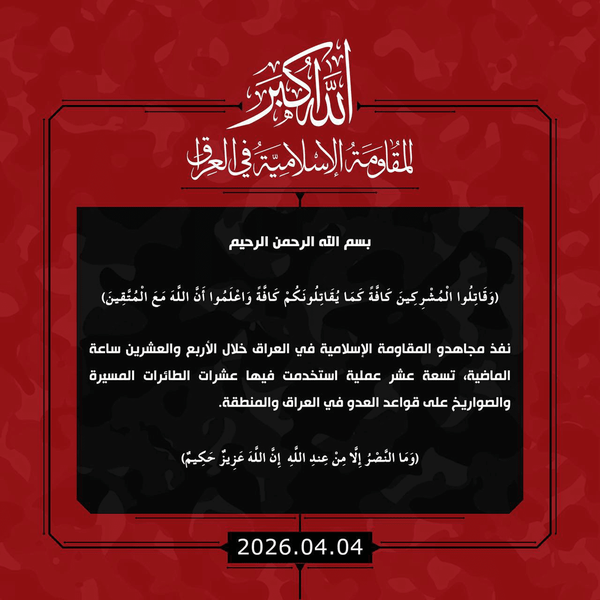 مقاومت اسلامی عراق با انتشار بيانيهاي خبر داد كه طی 24 ساعت گذشته، با استفاده از ده ها فروند پهپاد و موشک، 19 عملیات علیه پایگاه های آمريكا در عراق و منطقه انجام داده است.