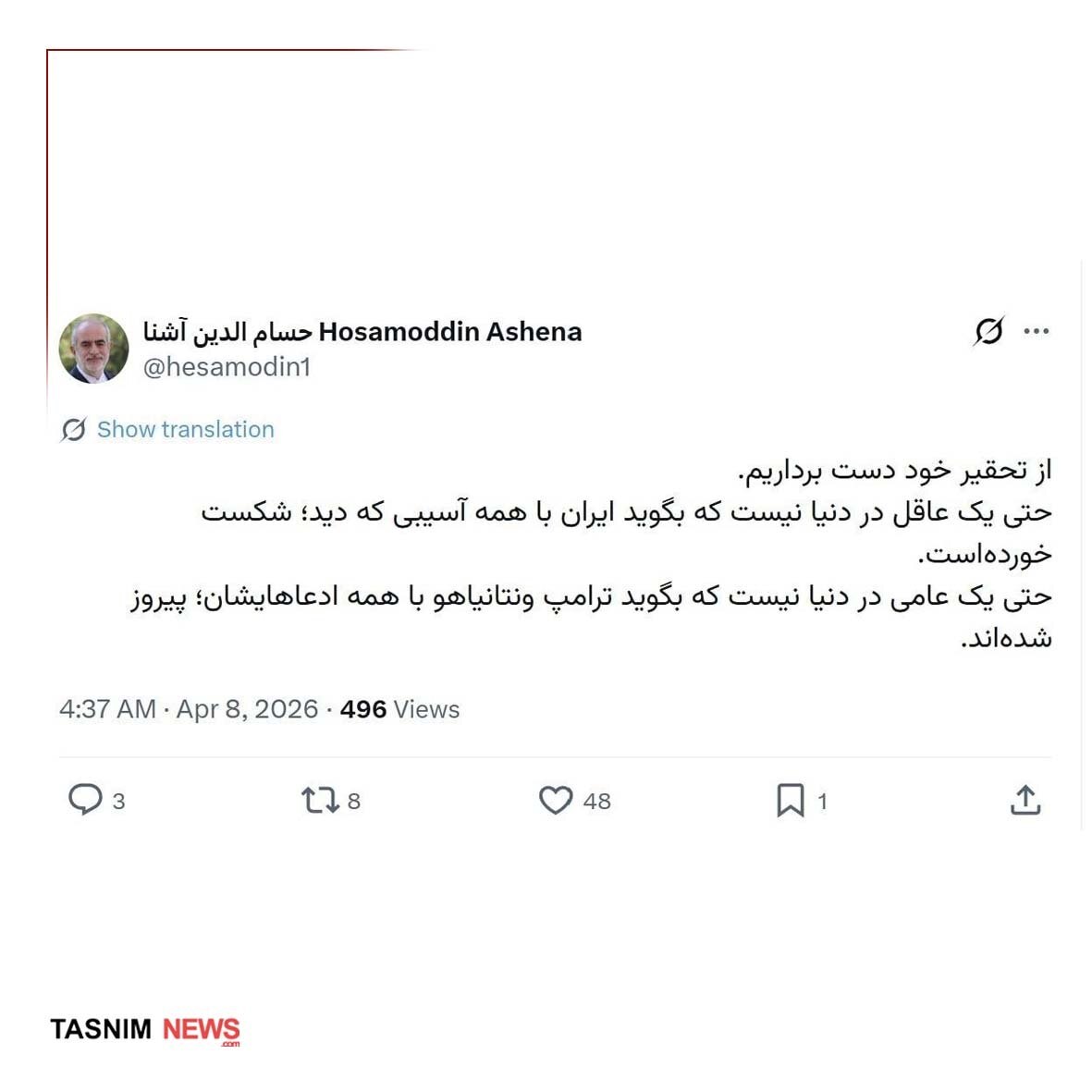 حسام الدین آشنا در پستی نوشته است: از تحقیر خود دست برداریم.حتی یک عاقل در دنیا نیست که بگوید ایران با همه آسیبی که دید، شکست خورده‌ است.