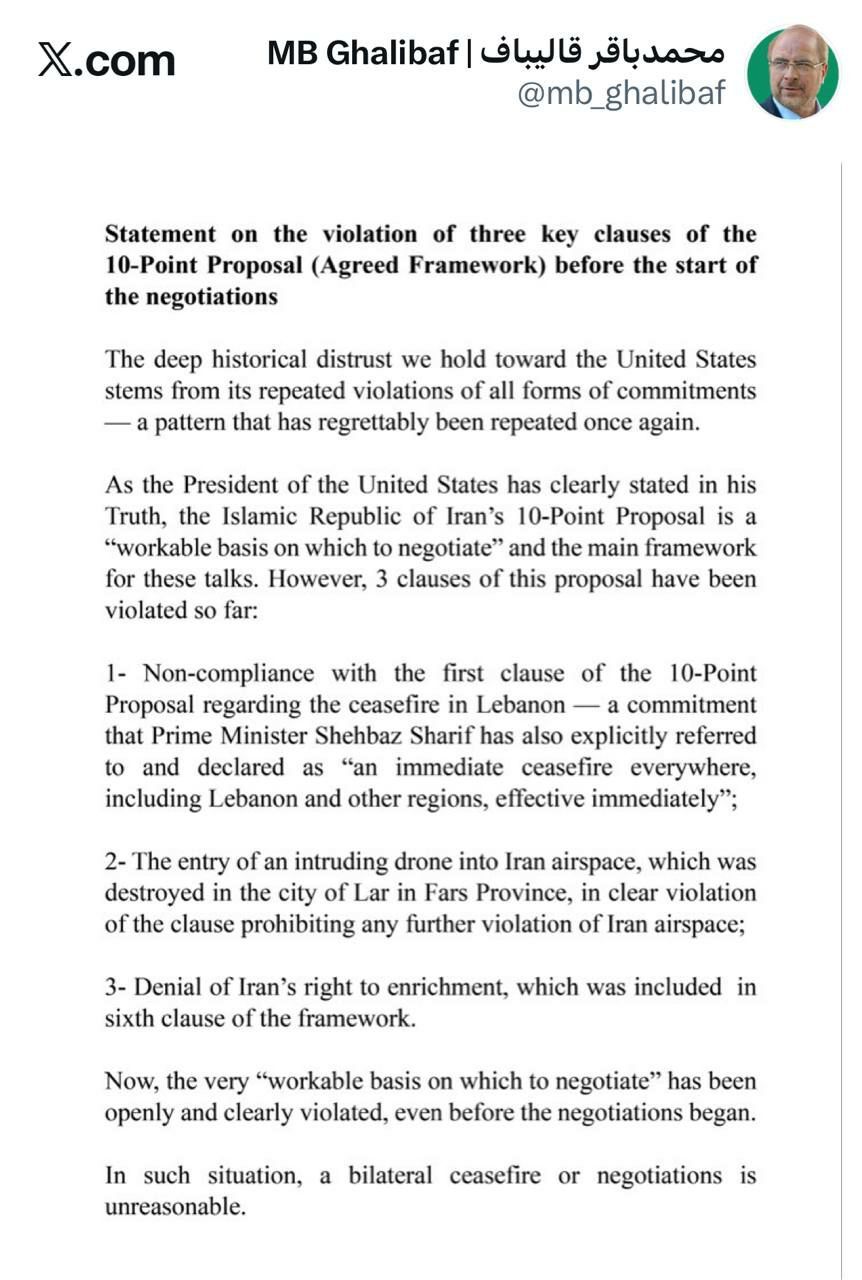 به گزارش تابناک، محمدباقر قالیباف رئیس مجلس در مطلبی در صفحه شخصی خود در شبکه اجتماعی ایکس، بیانیه‌ای را به زبان انگلیسی منتشر کرد که به شرح زیر است.