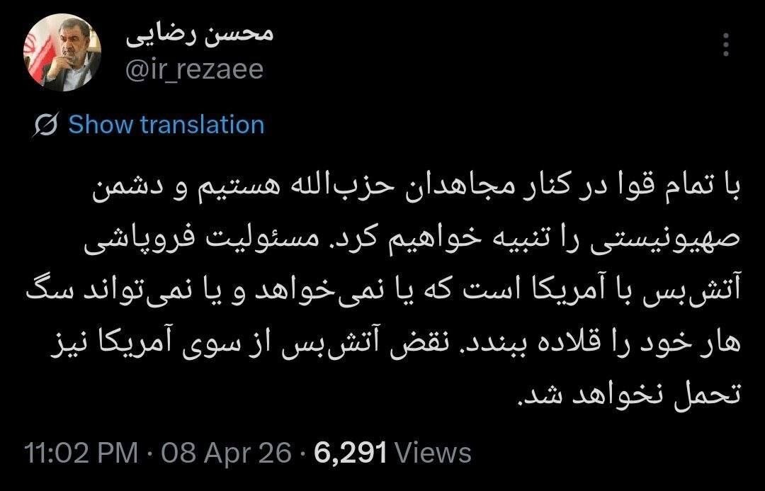 محسن رضایی: مسئولیت فروپاشی آتشبس با آمریکاست