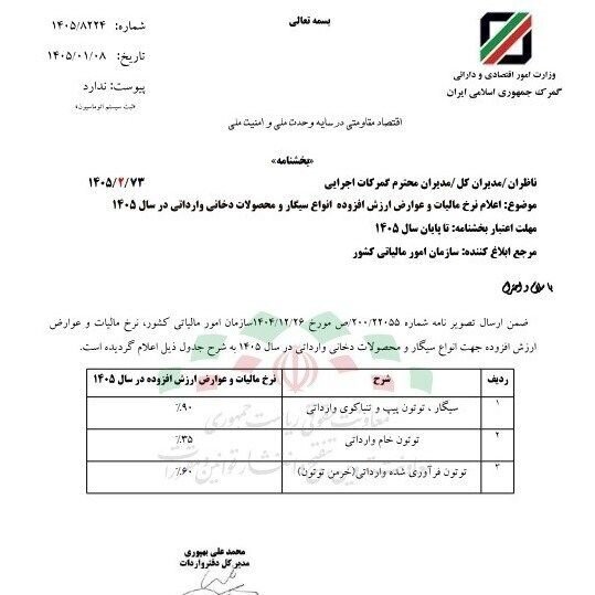 به گزارش تابناک به نقل از تسنیم؛ براساس بخشنامه گمرک، نرخ مالیات و عوارض ارزش افزوده سیگار، توتون، پیپ و تنباکوی وارداتی ۹۰ درصد، توتون خام وارداتی ۳۵ درصد و توتون فرآوری شده وارداتی ۶۰ درصد اعلام شد.