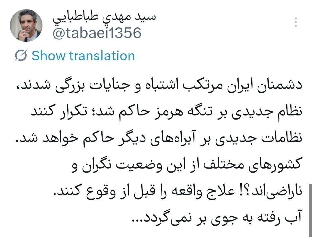 به گزارش تابناک؛ معاون ارتباطات و اطلاع‌رسانی دفتر رئیس جمهور در پستی نوشته است: دشمنان ایران مرتکب اشتباه و جنایات بزرگی شدند، نظام جدیدی بر تنگه هرمز حاکم شد؛ تکرار کنند نظامات جدیدی بر آبراه‌های دیگر حاکم خواهد شد.