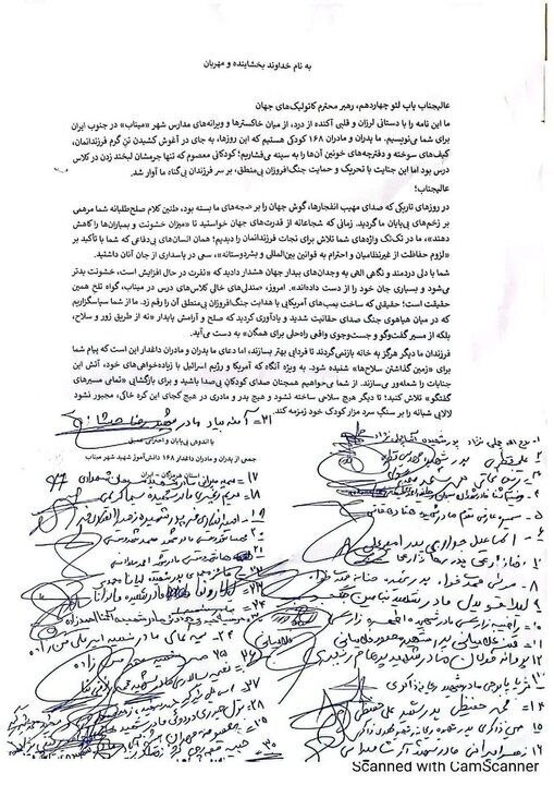نامه جمعی از خانوادههای کودکان شهید میناب به پاپ