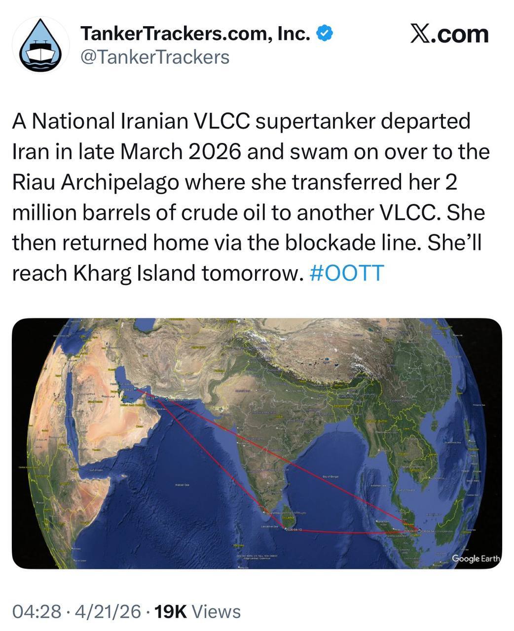 یک ابرنفتکش متعلق به شرکت ملی نفتکش ایران در اواخر مارس ۲۰۲۶ از ایران حرکت کرد و به سمت مجمع‌الجزایر ریائو حرکت کرد.