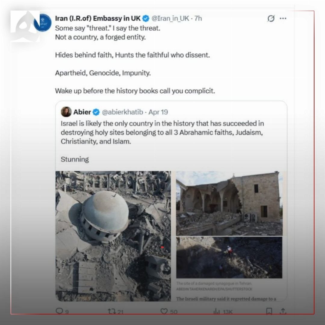سفارت ایران در انگلیس در واکنش به حملات رژیم صهیونیستی به اماکن ادیان مختلف در ایران، این رژیم را «نهادی جعلی و ساختگی» خواند.
