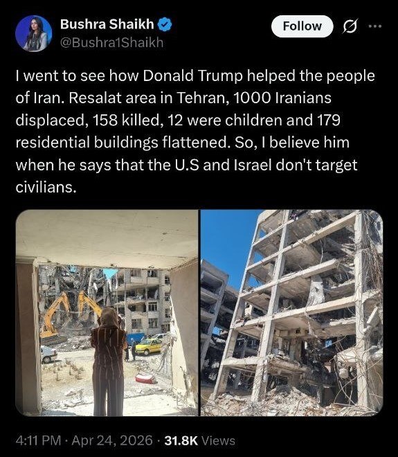 به گزارش تابناک؛ بشری شیخ تحلیلگر بیبیسی در سفر به ایران در صفحه خود نوشت: من رفتم تا ببینم دونالد ترامپ چطور به مردم ایران کمک کرده! منطقه رسالت در تهران، ۱۰۰۰ ایرانی آواره، ۱۵۸ کشته که ۱۲ نفرشون کودک بودند و ۱۷۹ واحد مسکونی با خاک یکسان شده. بنابراین، من حرف ترامپ رو باور میکنم وقتی که میگه ایالات متحده و اسرائیل غیرنظامیها رو هدف قرار نمیدن!