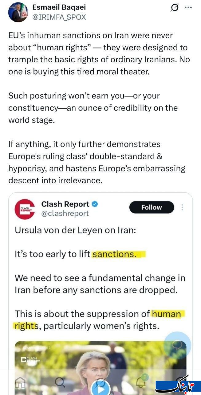 به گزارش تابناک، اسماعیل بقائی سخنگوی وزارت امور خارجه در واکنش به سخنان رئیس کمیسیون اروپایی که ادعا کرده است «زود است راجع به رفع تحریمهای ایران صحبت کنیم»، در شبکه ایکس نوشت: