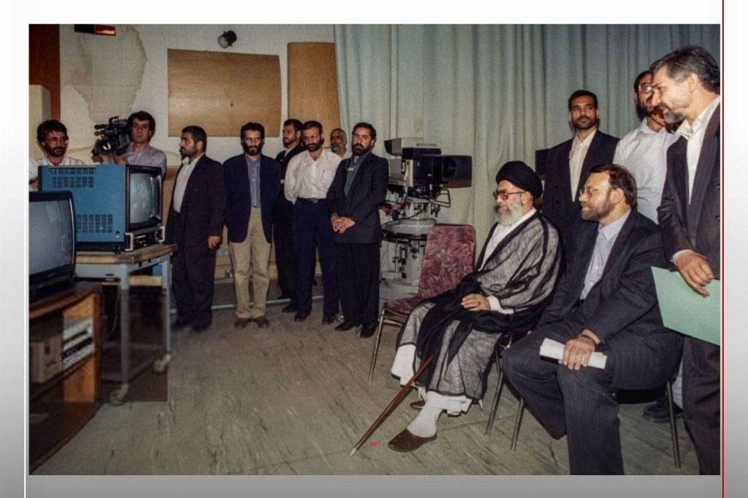 تصویری از حضور رهبر شهید انقلاب در صداوسیما بههمراه شهید دکتر علی لاریجانی را می بینید.