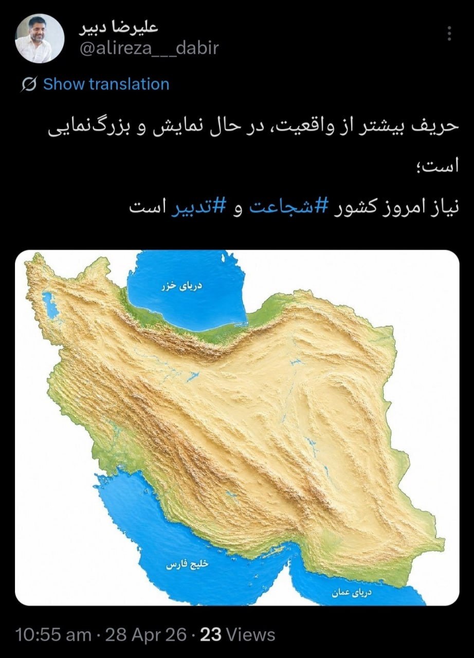 به گزارش تابناک؛ علیرضا دبیر در صفحه شخصی خود در نوشت: دشمن بیشتر از واقعیت، در حال نمایش و بزرگنمایی است. نیاز امروز کشور شجاعت و تدبیر است