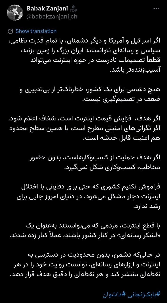 به گزارش تابناک؛ بابک زنجانی ؛ با انتشار توییتی در شبکه اجتماعی ایکس از مضرات قطعی طولانی مدت اینترنت گفت.