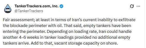 یک ساعت پیش، تانکرترکرز  اعلام کرد، بسته به نرخ بارگیری، ایران می‌تواند ۴ تا ۶ هفته دیگر (یک ماه و نیم دیگر) بارگیری نفتکش‌ها را مدیریت کند و این زمان  مشروط بر این است که نفتکش‌های خالی دیگری وارد خلیج فارس نشوند. بعلاوه، ایران فضای خالی ذخیره‌سازی در خشکی هم دارد.