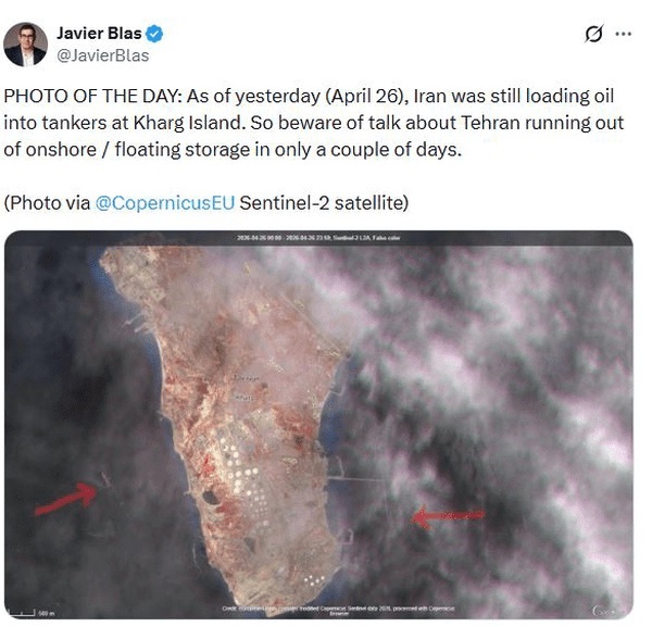ساعاتی پس از این اظهارات ترامپ، ستون‌نویس بلومبرگ، خاویر بلاس، در صفحه شخصی‌اس نوشت: «نمی‌دانم ترامپ در مورد چه چیزی صحبت می‌کند.» وی با انتشار تصویر ماهواره‌ای نفتکشی که در حال بارگیری نفت در جزیره خارک بود، به ترامپ هشدار داد: «مراقب صحبت‌هایی که در مورد پر شدن ذخایر خشکی و شناور تهران در عرض چند روز می‌کنید، باشید.»