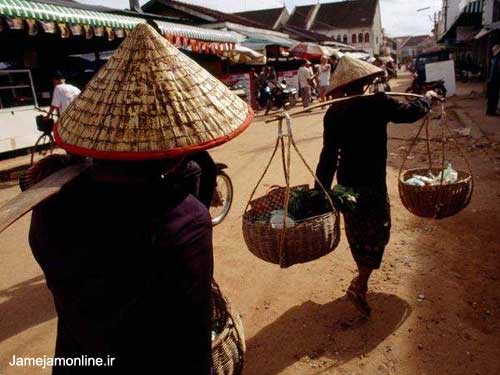 كشاورزان كامبوجي محصولاتشان را توسط سبدهاي بامبويي سنتي به بازار سيئم ريپ مي آورند.