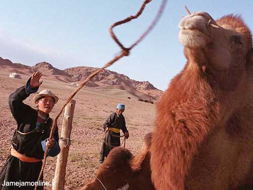 يك چادرنشين مغول در صحراي گوبي شترش را مهار ميكند تا با خانواده به محل تازهاي كوچ كند.
