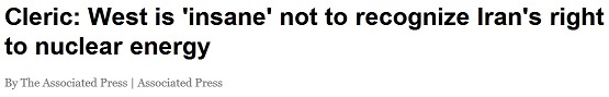 آسوشیتدپرس در این زمینه مینویسد، یک روحانی بلندمرتبه ایرانی گفته کشورهای غربی باید «بیعقل» باشند که حقوق ایران برای دستیابی به انرژی هستهای را به رسمیت نمیشناسند. اشاره این خبرگزاری به بخشی از خطبههای نماز جمعه دیروز است که آیتالله جنتی گفته بود، کشورهای غربی «باید جمهوری اسلامی و انرژی هستهای را قبول کنند و باور کنند که ما مقصدی جز صلح آمیز بودن انرژی هستهای نداریم و مطمئن هستم که اینجاهلها هم در آخر کاری را میکنند که باید از اول میکردند. خداوند به آنها عقل دهد و ما را از دست این دیوانهها نجات دهد».