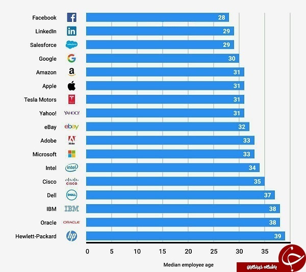فیسبوک که یکی از بزرگترین و مدرنترین شرکت های جهان به شمار می رود با در نمودار زیر با میانگین سنی 28سال در رتبه اول قرار دارد. اعتماد به نیروهای تازه نفس و جوان جز اولویت های انتخاب کارمندان و کارگران در سراسر جهان است و بنگاه های اقتصادی با استفاده از این نیروها بازدهی و کارایی بیشتری را از خود نشان می دهند.