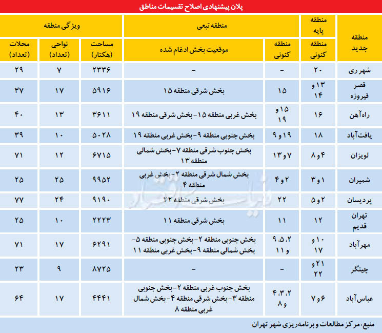 مدیریت شهری تهران با تکیه بر مطالعاتی که سال 92 مرکز مطالعات و برنامهریزی شهر تهران انجام داده و همچنین با استناد به تکلیفی که طرح جامع شهر تهران بر عهده شهرداری گذاشته قصد دارد ساختار کلانشهر تهران را از طریق تقسیمبندی جدید مناطق، نواحی و محلات شهری دگرگون و یک تقسیمبندی جدید برای مناطق پایتخت طراحی کند. برای این منظور کمیسیون عمران شورای شهر تهران طرحی را تنظیم کرده که قرار است پس از تکمیل و جمعبندی در شورا مطرح شود. بررسیهای «دنیای اقتصاد» از جزئیات این طرح و همچنین مطالعات پشتیبان آنچه در مرکز مطالعات و برنامهریزی شهر تهران انجام شده حاکی است که مدیریت شهری تهران بنا دارد تهران جدید را در قالب تجزیه و تفکیک مناطق بزرگ و گسترده و ادغام مناطق کوچک به یک کلانشهر با 11 منطقه تبدیل کند. تهران جدید اگرچه به لحاظ تعداد مناطق سبکتر میشود اما تعداد ناحیهها و از آن مهمتر تعداد محلات با افزایش چشمگیری مواجه میشود بهطوری که تعداد آنها 4/ 1 برابر بیشتر میشود.