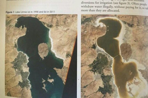تصویر مربوط به صفحه‌ای از کتاب جغرافیای دانش‌آموزان استرالیایی درباره پیامدهای مخرب انتقال آب است. تصویری که برای ایرانیان بسیار آشناست: تصویر مقایسه دریاچه ارومیه قبل و بعد از خشک شدن. تصویری که گویای بی‌توجهی ما ایرانیان به مایه حیات است.
