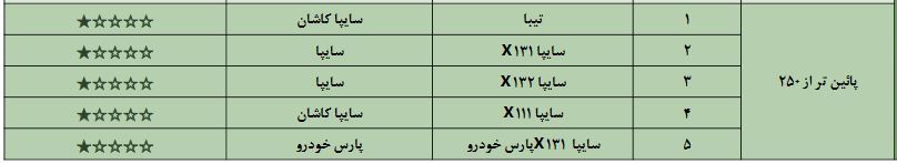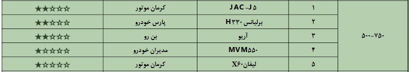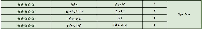 در این رتبه بندی چهار خودرو از محصولات سایپا،مدیران خودرو، بهمن موتور و کرمان خودرو وجود دارد که شامل سواری کیا سراتو با سه ستاره،تیگو 5 با سه ستاره،آسا با دو ستاره و جک اس 5 با دو ستاره کیفی می شود.؛خودرو تیگو 5 تنها خودرویی بوده که در این گروه توانسته با بهبود کیفیت از دوستاره شهریورماه به سه ستاره در مهرماه را کسب نماید.
