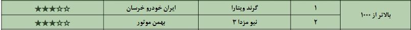 آخرین گروه بندی خودروها مربوط به سواری های بالای 100 میلیون تومان است که تنها شامل دوخودروی گرند ویتارا و مزدا 3 جدید می شود که به ترتیب برای دو خودرو سازی ایران خودرو خراسان و بهمن موتور است؛دو خود روی این گروه سه ستاره کیفی از پنج ستاره را کسب کرده اند.