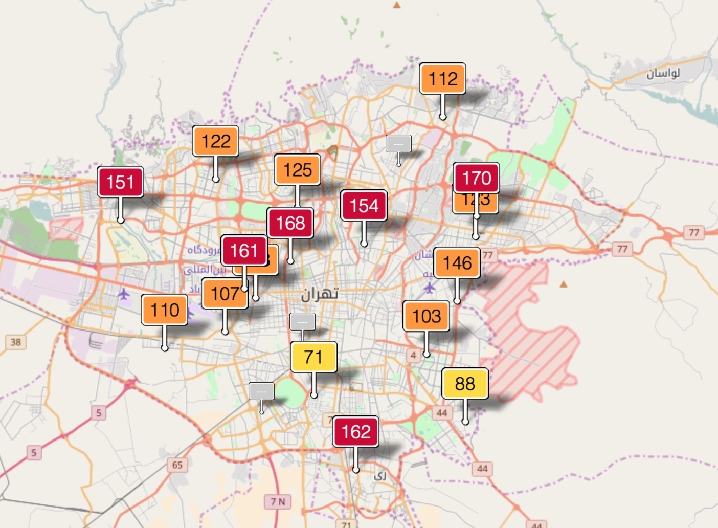 هوای هیچ منطقه ای در تهران اکنون پاک نیست. فقط دو منطقه در محدوده سالم قرار دارند؛ مسعودیه و منطقه ۱۶.
