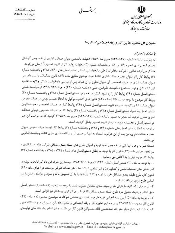 وزارت کار با ابلاغ بخشنامه ای، ابطال دستورالعمل های«برقراری عدالت مزدی برای کارهای هم ارزش در شرایط یکسان» را رسما پذیرفت.