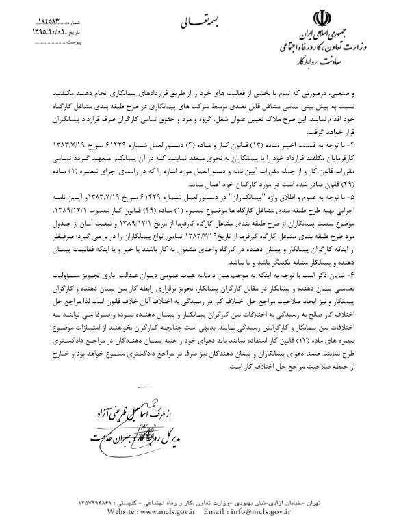 دستورالعمل دی ماه۹۲ ضوابط مربوط به اجرای طرح طبقه بندی مشاغل در مورد پیمانکاران طرف قرارداد با اشخاص حقیقی یا حقوقی در خصوص منبع تبعیض در پرداخت دستمزد بود و بر اساس دستورالعمل اسفندماه ۹۳ نیز در صورتی که پیمان دهنده و پیمانکار موجبات تضمین حقوق کارگران پیمانکار را فراهم نیاورند به استناد به تبصره (۲) ماده (۱۳) قانون کار مکلف به پرداخت دیون پیمانکار به کارگر خواهند بود.