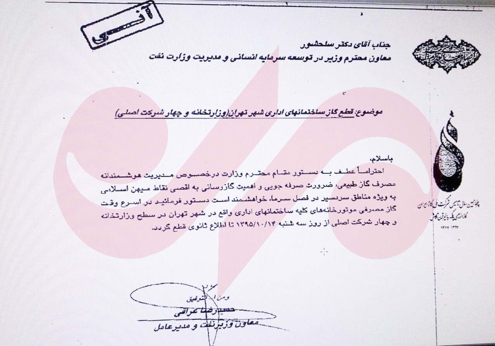 در نامه ارسالی شرکت ملی گاز به معاونت منابع انسانی وزارت نفت، آمده است: «به دستور مقام عالی وزارت، در خصوص مدیریت هوشمندانه مصرف گاز طبیعی، ضرورت صرفهجویی و اهمیت گازرسانی به تمامی مناطق کشور با اولویت مناطق سردسیر در فصل سرما، خواهشنمند است، دستور فرمایید در اسرع وقت گاز مصرفی موتورخانههای تمامی ساختمانهای اداری وزارت نفت و چهار شرکت اصلی تا اطلاع ثانوی قطع شود.