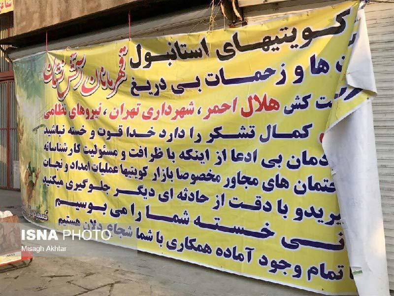 بنر نصب شده مقابل بازار كويتي ها توسط كسبه در قدرداني از نيروهاي امداد و نجات