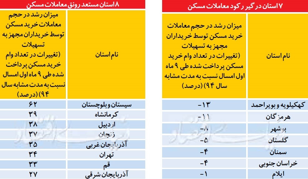 بیشترین افت پرداخت وام مسکن مربوط به استان کهکیلویه و بویراحمد با نرخ منفی 13 درصد است و پس از آن استانهای هرمزگان با 11- درصد، بوشهر با 8- درصد، گلستان با 5- درصد، سمنان با 4- درصد، خراسان جنوبی با 4- درصد و ایلام با 1- درصد در مراتب بعدی قرار دارند.
