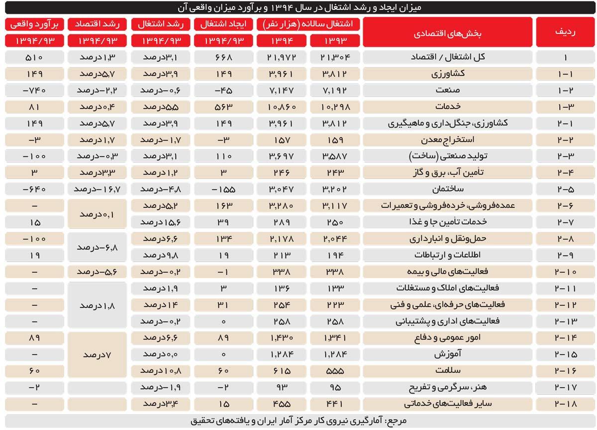 جمعبندی دادههای اشاره شده حاکی از این است در بهترین حالت ممکن، نه فقط در سال ١٣٩٤ اشتغال کشور افزایش نیافته که حداقل به میزان ٥١٠ هزار نفر کاهش یافته است. حتی اگر اشتغالی هم ایجاد شده باشد با توجه به سهم ٨٤درصدی بخش خدمات نامولد، بیکیفیت و ناپایدار و بر روال دولتهای مألوف است. این اشتغال حتی در صورت ایجاد هم منجر به خلق تولید ناخالص داخلی باکیفیت و مفید نمیشود، چنانچه از سال ١٣٩٣ به بعد، مجموع اشتغال در بخشهای صنعت و کشاورزی ثابت باقی مانده است.