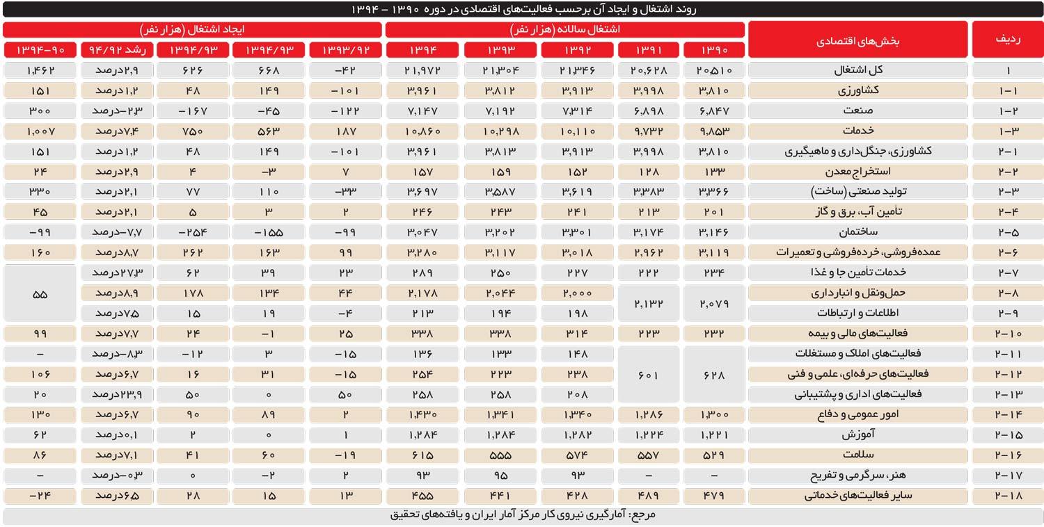 در سال ١٣٩٣ کل اشتغال کشور ٤٢ هزار نفر کاهش یافت و در سال ١٣٩٤ این روند معکوس شد و در این سال ٦٦٨ هزار شغل ایجاد شد که مجموع تراز ایجاد اشتغال سالهای ١٣٩١ و ١٣٩٢ را به ٦٢٦ هزار نفر (سالانه ٣١٣ هزار نفر) رساند. از کل اشتغال ایجادشده در سال ١٣٩٤، ٥٦٣ هزار نفر مربوط به بخش خدمات است که ٨٤ درصد از کل را شامل میشود.