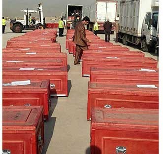 تعداد زیادی تابوت سرخ رنگ، برای حمل پیکر آتش نشان های شهید در فاجعه پلاسکو آماده شد.به گزارش رکنا، این تابوت ها برای تشییع پیکر پاک آتش نشان ها شهید از سوی مقامات قضایی، انتظامی، و شهرداری بررسی و تحویل گرفته شد.