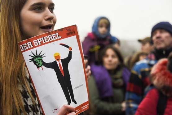 3 - یکی از هزاران نفر تظاهرکننده در شهر برلین هفته نامه اشپیگل را که روی جلد شماره روز پنجشنبه 2 فوریه را به این طرح گویا از ترامپ اختصاص داده است، در دست دارد.