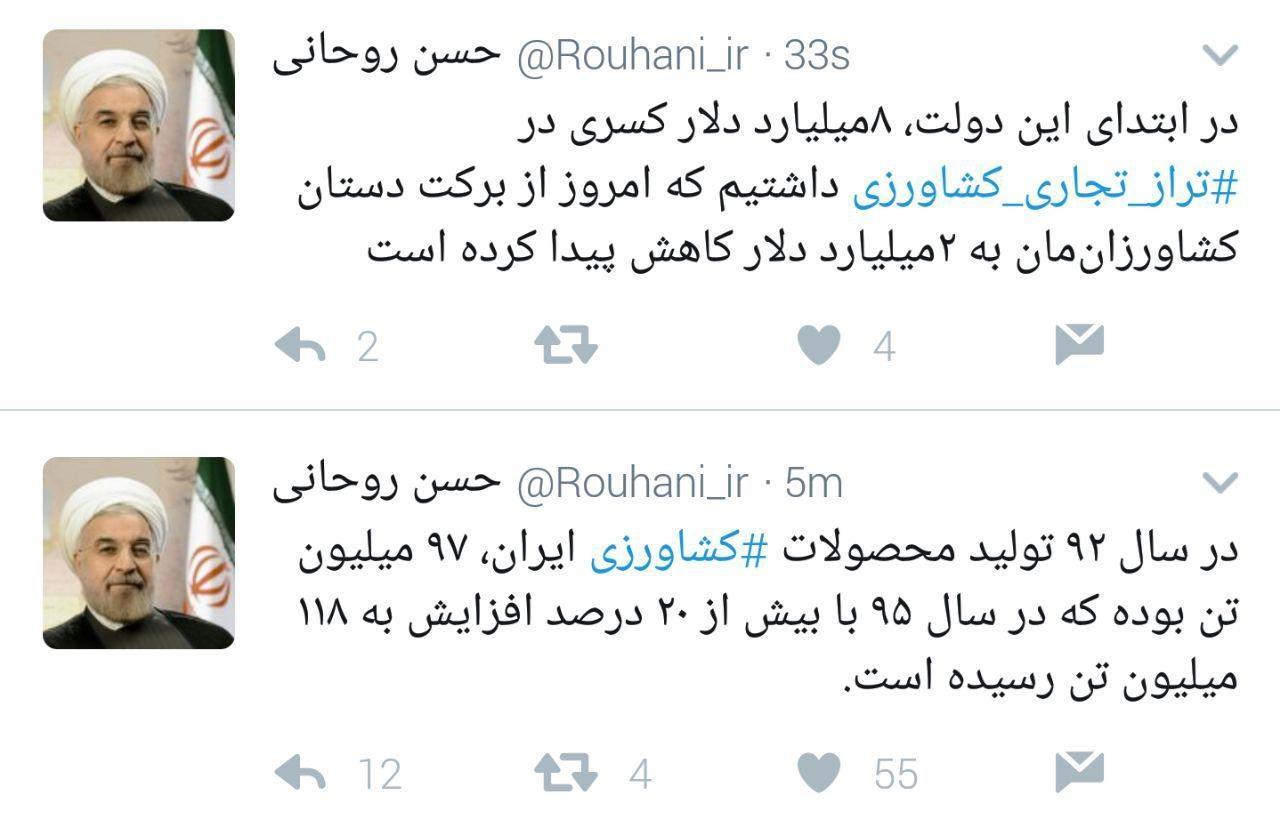 رییس جمهوری درباره تراز تجاری و تولیدات کشاورزی توئیتی را منتشر کرد.