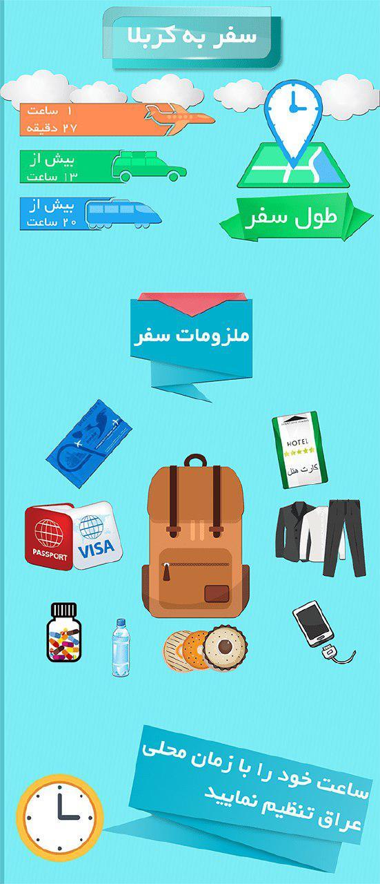 20 ساعت مدت زمان مسیر رفت به همراه زمان مورد نیاز برای استراحت و 20 ساعت زمان برگشت از کربلا مجموعا حدود 2 شبانه روز از زمان شما را طی نمودن مسیر ها اتلاف می نماید در حالی که با تور هوایی کربلا زمان طی شده در مسیر رفت و برگشت شما کمتر از 4 ساعت خواهد بود.
