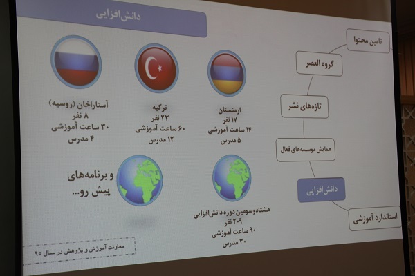 همچنین در این جلسه امیر پورپزشک، مدیر نمایندگیهای بنیاد سعدی گزارشی از فعالیتهای معاونت بینالملل در یکسال اخیر ارائه کرد و اقدامات راهبردی و زیرساختی در فعالیتهای خارج از کشور، تدوین سند راهبردی برای کل جهان در 10 منطقه زبانی و جغرافیایی، تهیه شناختنامه زبان فارسی در 35 کشور جهان، چگونگی فعالیت مدرسان و استادهای اعزامی از بنیاد سعدی و روند برگزاری دورههای دانشافزایی و دعوت فارسیآموزان از کشورهای مختلف را تشریح کرد.