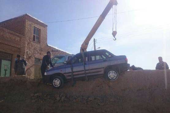 در تصویر زیر، این خودرو را در حالی مشاهده می کنید که سر از دیواری در روستای نسران از توابع بخش مرکزی شهرستان نطنز در استان اصفهان در آورده است.