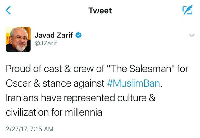 «به عوامل فیلم فروشنده برای کسب اسکار و ایستادن در مقابل "ممنوعیت ورود مسلمانان" افتخار میکنم. ایرانیان ارائه دهنده فرهنگ و تمدنی هزاران سالهاند.»
